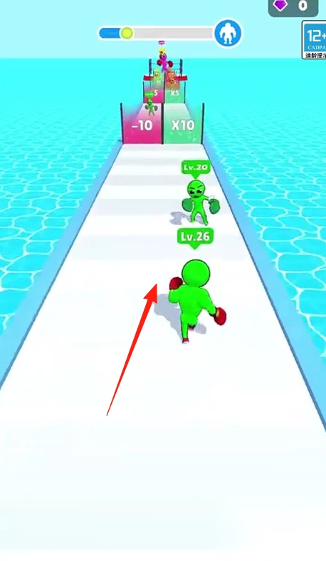 1、操控拳击手(图1红箭头),撞击同色角色升级(如Lv.26),避开减益门(-10),冲向终点擂台。