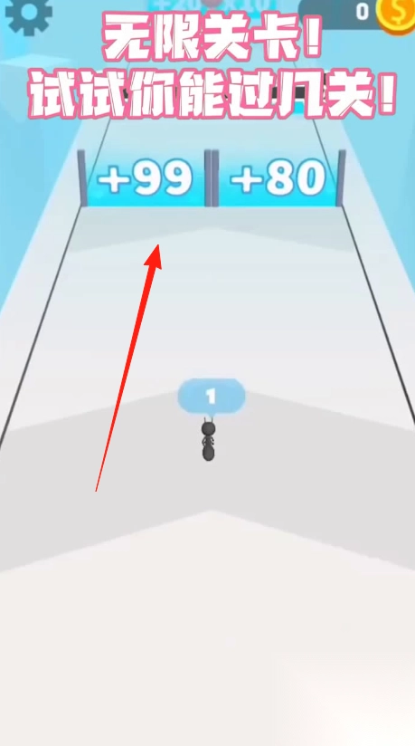 2、引导蚂蚁(图2红箭头),选高增益门(+99),积累数量,挑战“无限关卡”,刷新闯关纪录。