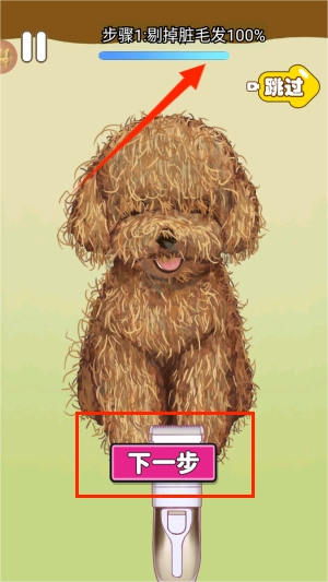 2、操作时需要根据指引顺序使用底部工具栏的清洁用品为小狗打理毛发。