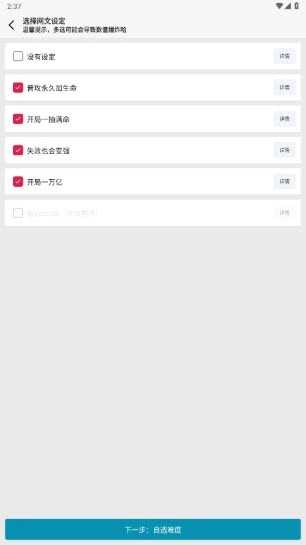 4、选择好网文的设定后点击屏幕底部的【下一步,自选难度】;