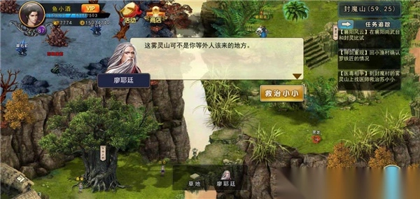 这次我们需要去封魔山雾灵山找廖耶延(60.25)医治小小,需要10个蜈蚣,1个金蚕,10个百年灵芝(等待2分钟)