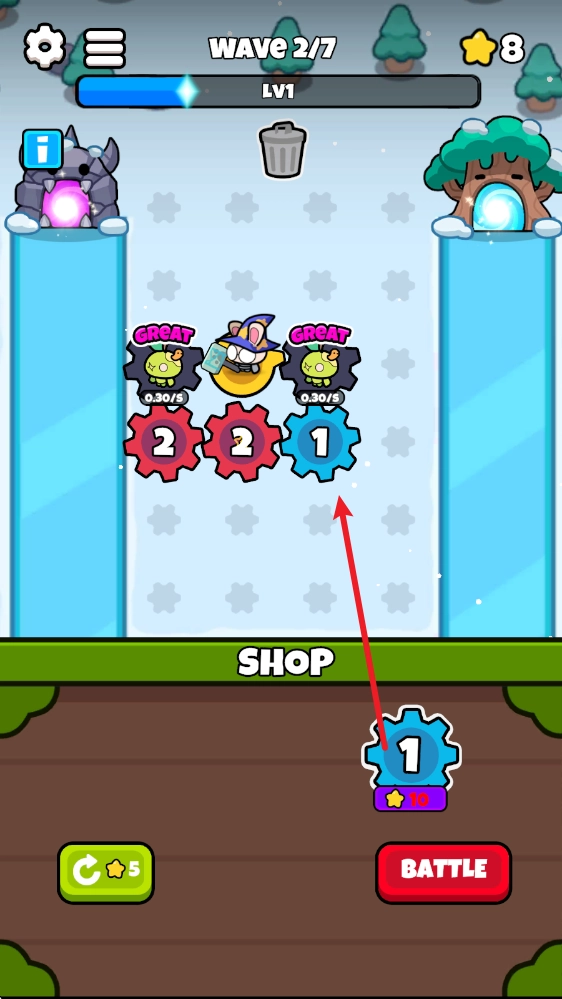 4、每完成一波战斗,我们都可以进行修整,拖动相同齿轮重叠即可进行合成。