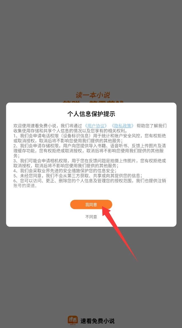 1、打开速看小说APP,先看看用户协议和隐私条款,没问题就点"我同意"继续用。