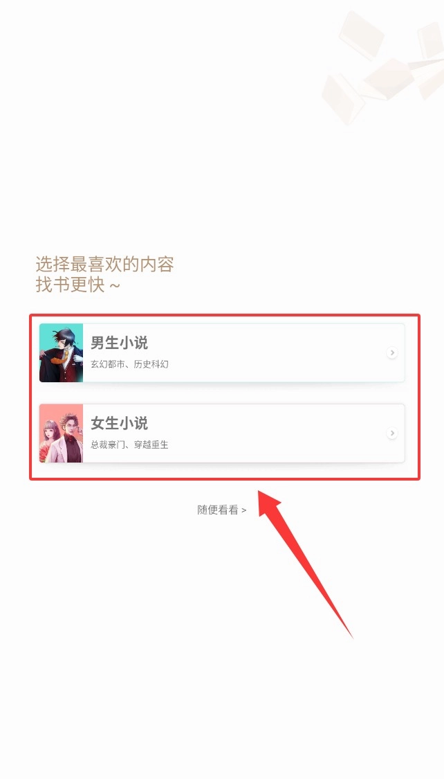 2、进入首页后能看到各种分类推荐,先选几个你感兴趣的小说类型,系统会记住你的偏好方便以后找书。