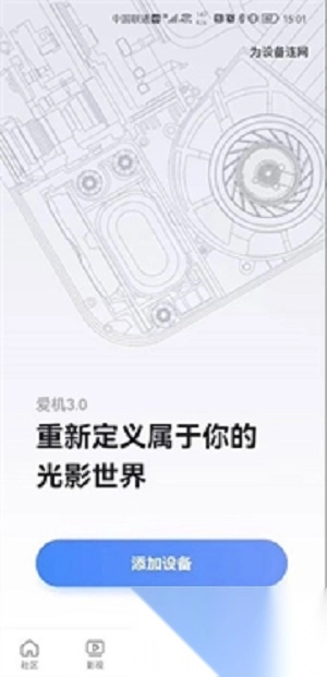 1. 确保极米投影仪和手机处于同一网络环境,接着打开手机上的极米APP ,选中【爱机】选项,此时会出现下图所示界面。点击界面中间的【添加设备】,点击后即可进入下一个页面。