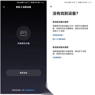 1. 在搜索页面,点击底部的【查看解决方法】,进入下一个页面,此时会看到两种额外的连接方式:【扫码连接设备】与【输入IP连接设备】。