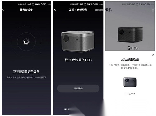 2. 进入【添加设备】,画面呈现如图1所示。此时需等待搜索,通常等待时长在5 - 20秒左右。当设备被搜索到后,点击【绑定设备】。随后,界面会提示填写验证码,准确输入极米投影仪画面所显示的验证码,即可绑定成功。
