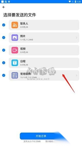 4、选择完成后回到前面,把其他勾选去掉,选择常用软件一项即可,点击开始迁移;