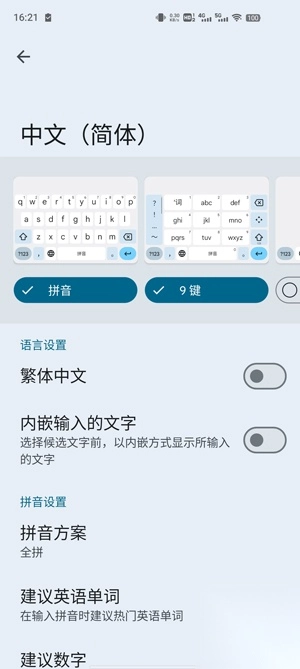 4.在“中文简体”中界面勾选拼音和9键就可以自由的切换26键和9键的输入法