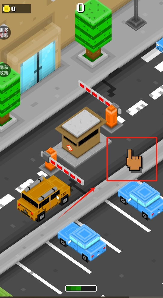 1、红黄蓝三辆车停像素停车场,按提示操作避开障碍找到车位。