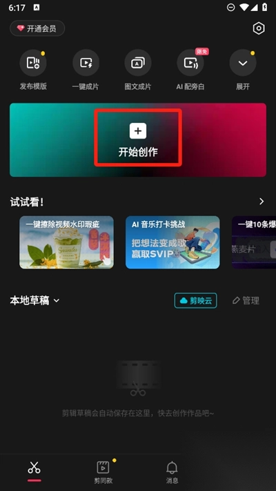 1、想要制作软件有多种方法,我们来看看直接进行自由编辑的方法吧,直接选择开始创作;