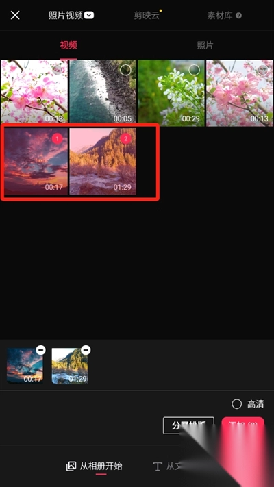 2、然后进入会看到手机中的视频或者照片格式,我们在这就选择视频进行创作吧;