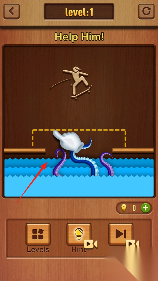 1. 点击【START】(红箭头所指处),进入level1,依照提示(手型标识),在章鱼上方绘制黄色线条,构建路径,以使滑板火柴人顺利通过。