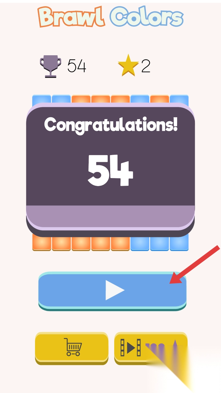 3、关卡结束后,点击蓝色箭头按钮继续游戏,也可通过下方按钮进入商店或观看视频获取星星。