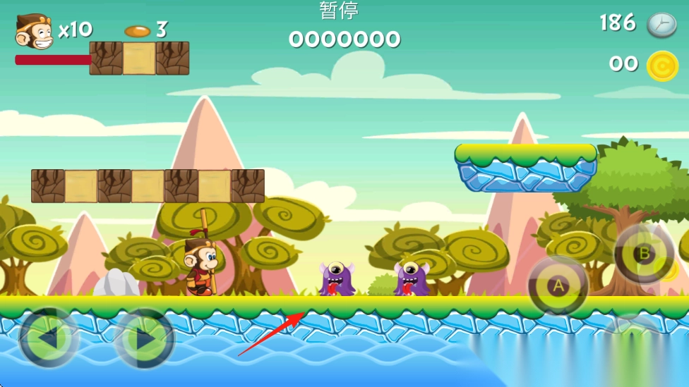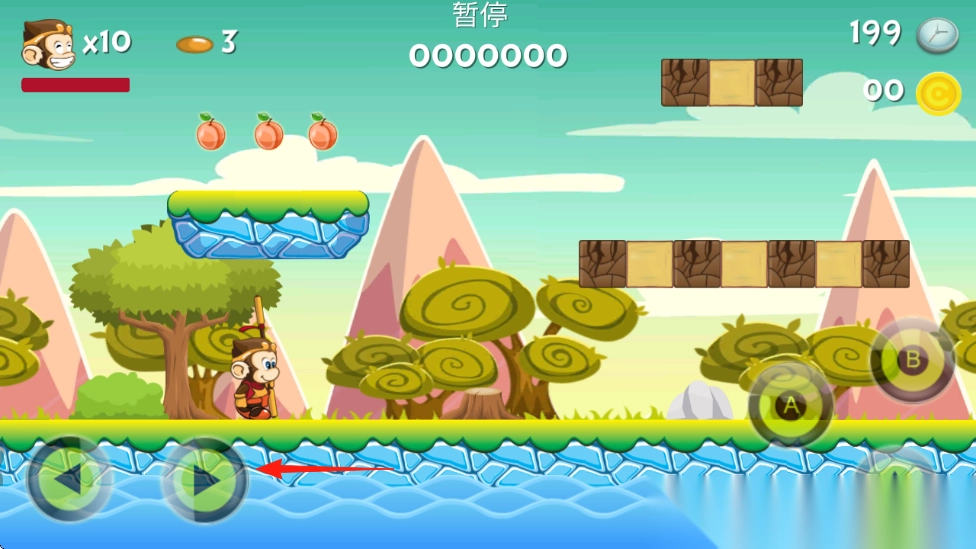 2、通过方向键操控角色进行基础移动,在草地与河流场景中行走,收集桃子(道具),跨越冰块(障碍)。