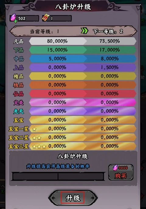 3、玩家能够借助对八卦炉进行升级,从而提高获取高阶装备的概率。