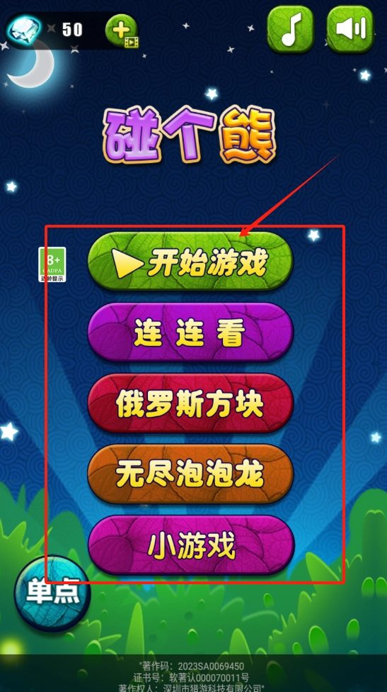 2、点击彩色的“开始游戏”等游戏按钮进入玩法,也可以点击“连连看”等选项选择不同游戏,顶部能够调整音量。
