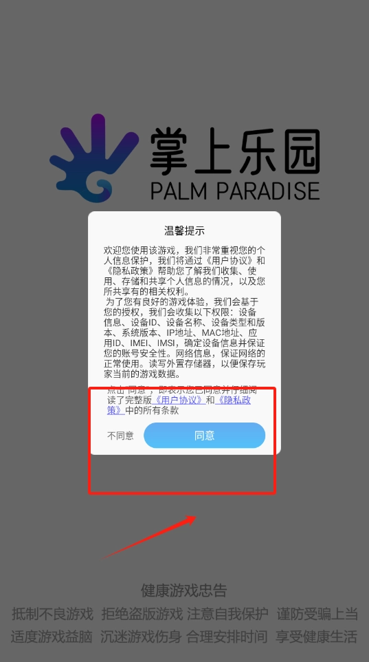 1、若接受隐私协议,点击蓝色的同意按钮;若放弃登录,则点击不同意按钮。此外,底部设有健康游戏提示。