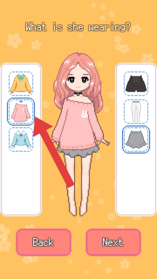 1、从文字描述来看,她穿着什么?画面呈现出一个有着粉色头发的卡通女孩,其左右两边设有服装选择栏,用户能够从中挑选自己中意的服饰,这属于换装互动类型。