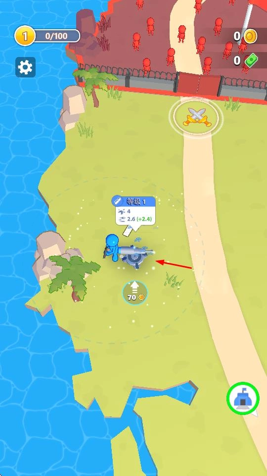 2、消耗金币(70、50)建造/升级炮台、飞机,布置在路径旁,攻击红色火柴人敌人。