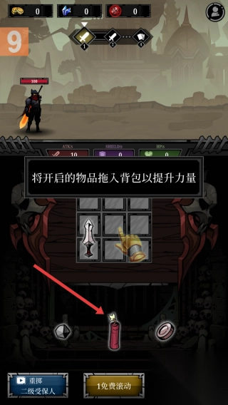 2、整理背包:拖动红色蜡烛至背包空格,配置道具提升战力。