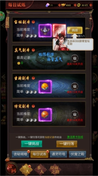 2、副本挑战:副本中除了能获得装备外,还能获得金币,装备可以出售换取更多金币。