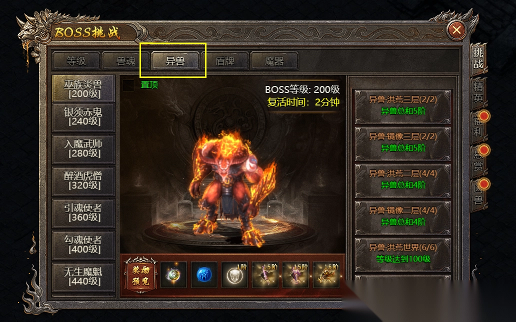 3、多击杀对应等级的BOSS(例如200级的巫族炎兽),也可经由灵符商店迅速获取转生材料。