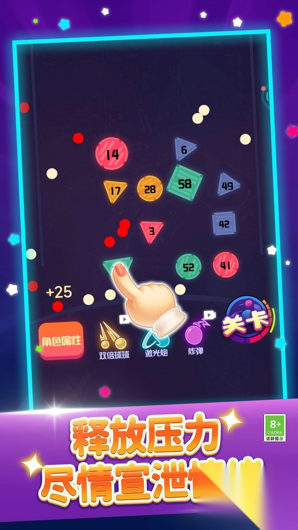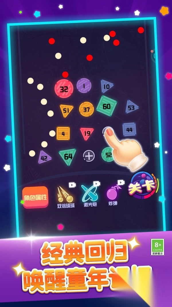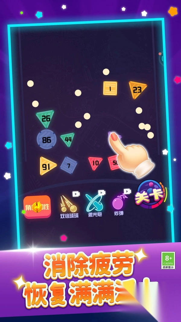 1、滑动屏幕调整弹珠发射角度,长按可蓄力提升射击强度,击碎数字方块;