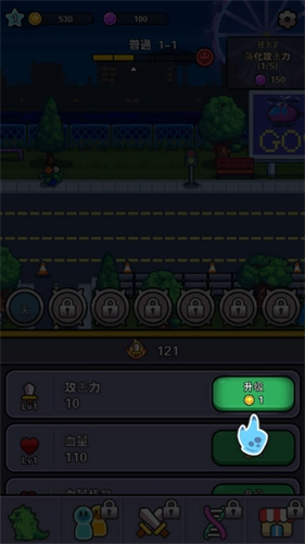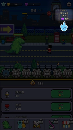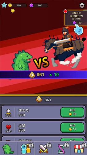 2、游戏采用放置挂机的模式进行,通过战斗可以获取金币,消耗金币则可以升级对应属性;