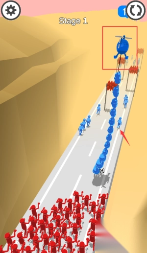 2、点击红框直升机空投道具,协助蓝人队伍前进。
