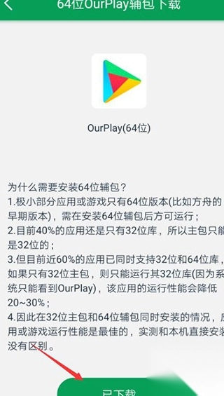 2、下载完毕,前往“我的”-“设置”-“64位OurPlay辅包下载”下载辅包;
