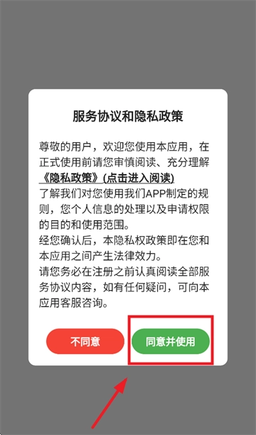请下载、安装并打开当当来骑手端APP。当出现服务协议和隐私政策提示界面时,点击“同意并使用”。