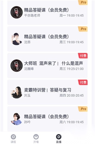 2、点击课程,我们可以再这个功能板块中看到非常丰富的练歌课程,如流行唱法、公益分享课、霸王课、嘻哈说唱等等;