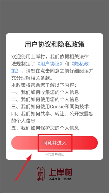 首先下载上岸村app,完成安装后打开该应用。当出现用户协议与隐私政策提示界面时,点击“同意”选项,随即进入应用。