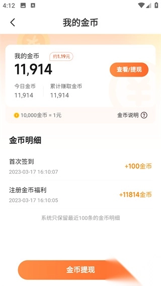 3、在这个界面可以看到账户拥有的金币数量以及可以做的任务。完成这些任务可以获得金币,快来手机越来越多的金币吧;当用户手机到足够多得金币想提现时,只需要在福利界面点击查看/提现处;