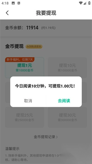 5、接着选择你想要提现的金额,只要满足阅读时长,就能完成提现。