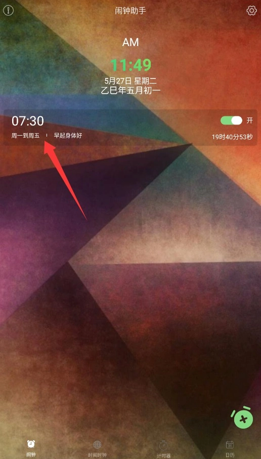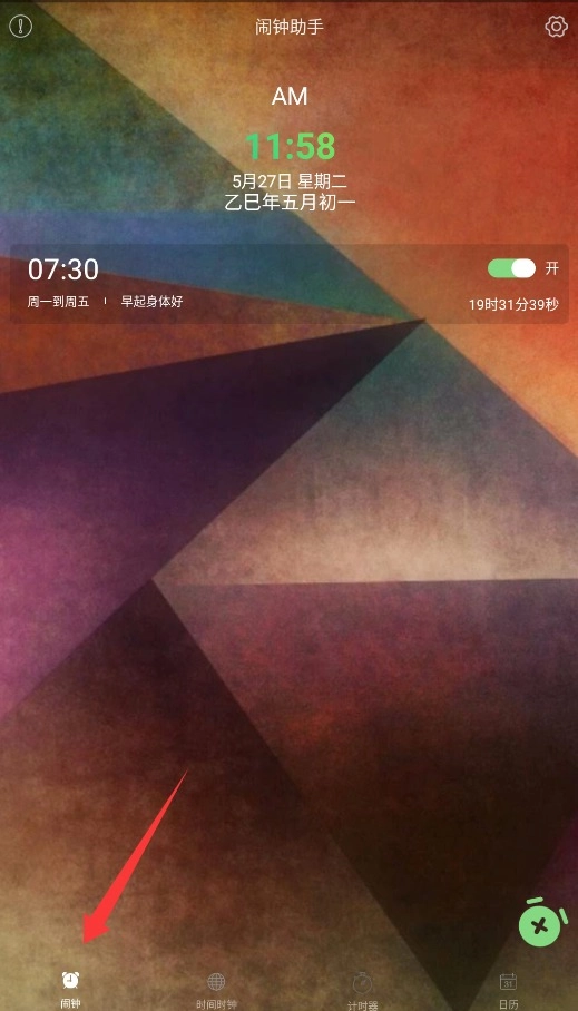 1、首次打开闹钟助手APP后,点击底部导航栏的"闹钟"选项卡,进入已设置闹钟的管理界面查看所有闹钟。