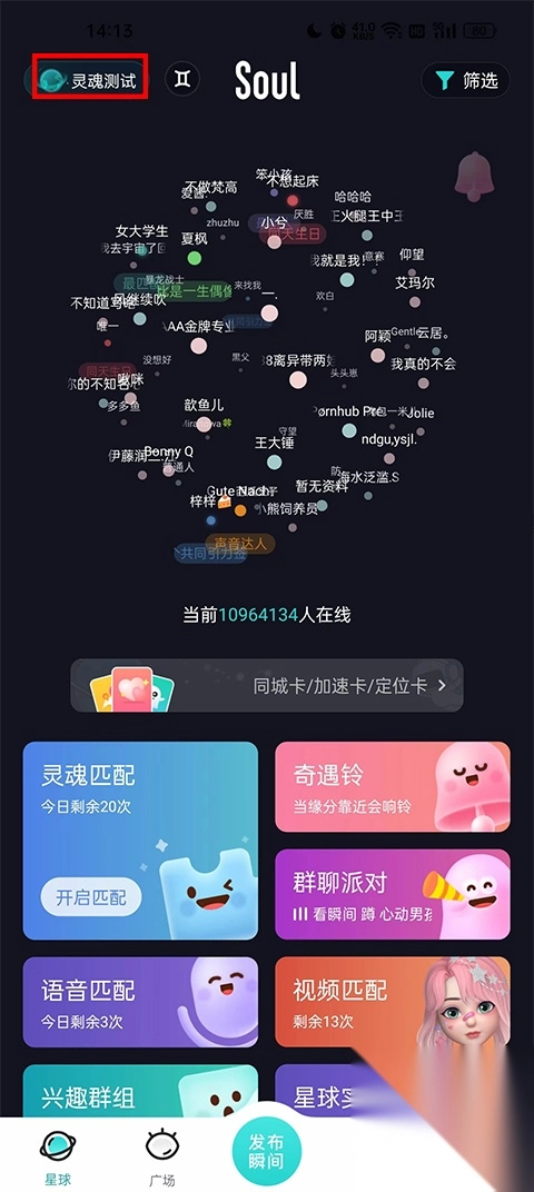 3、我们首先要点击左上角进行灵魂测试,只有这样才能匹配到与自己更加契合的异性;