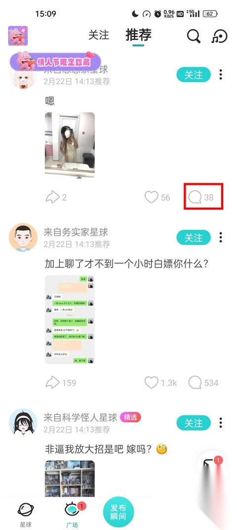 6、你还可以来到广场查看自己关注或者系统推荐的其他用户的动态,你也可以进行评论交流;
