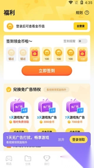 5、点开福利,玩家可以签到领金币、然后可以用金币兑换的特权,让你玩游戏更加轻松;