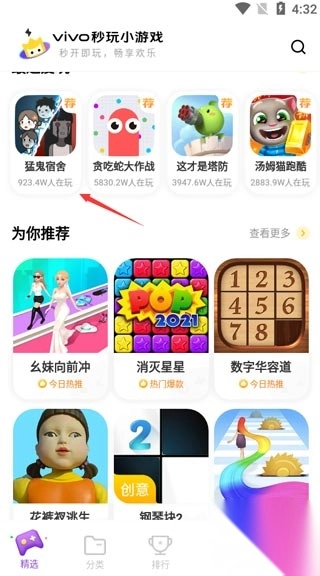 2、精选之中,无论是近期热门的猛鬼宿舍,还是经典热门游戏贪吃蛇大作战,又或是刚刚上线的小游戏,这里统统都有。