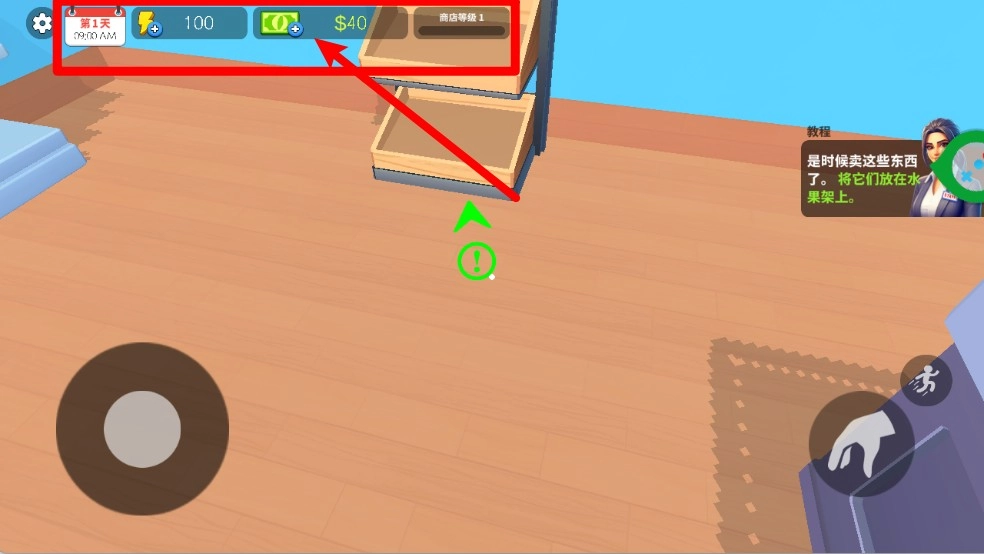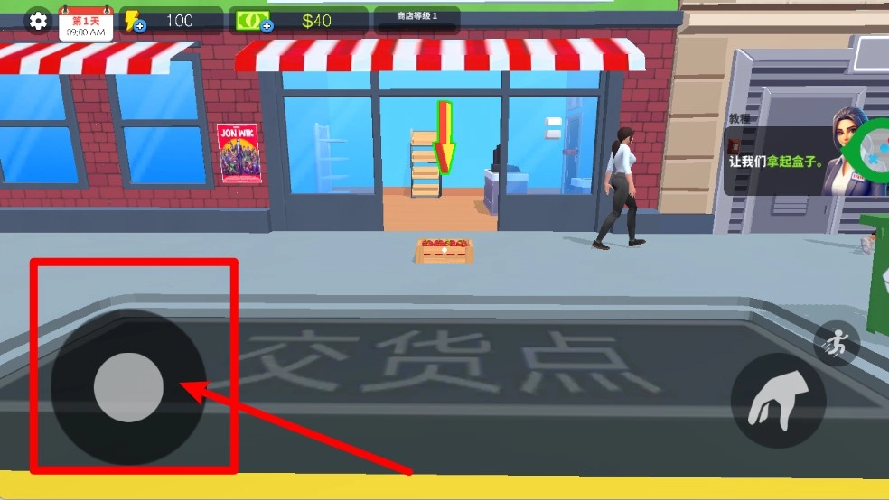 3. 通过左下角的虚拟摇杆来操控人物移动,能够自由穿梭于商店与街道之间,迅速完成从交货点取货并到货架补货的整个流程。