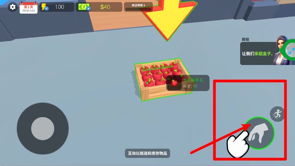 2.靠近货品后点击右下角手掌按钮即可拾取物品,进行上架或运输操作,注意数量限制和搬运效率保持顺畅作业。