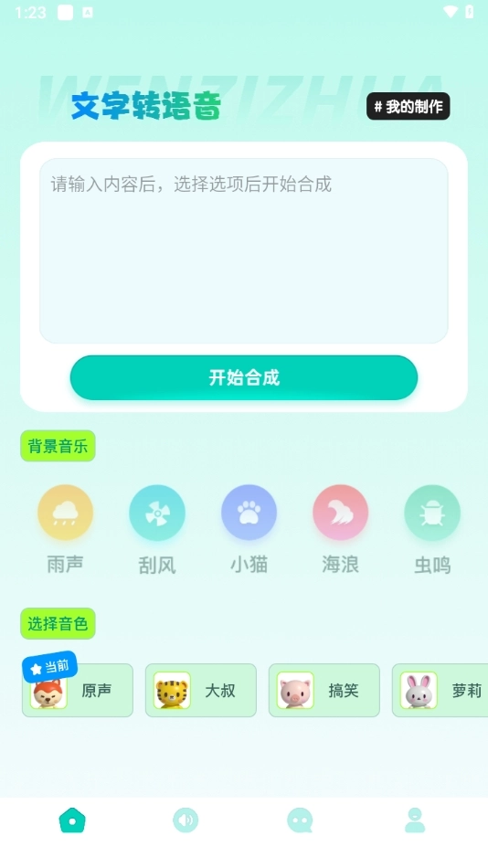 1、在软件首页,便能看到文字转语音功能。它不仅能将录制的语音信息全部转化为文字,还支持使用各种音色录制一段话,实用性颇高。