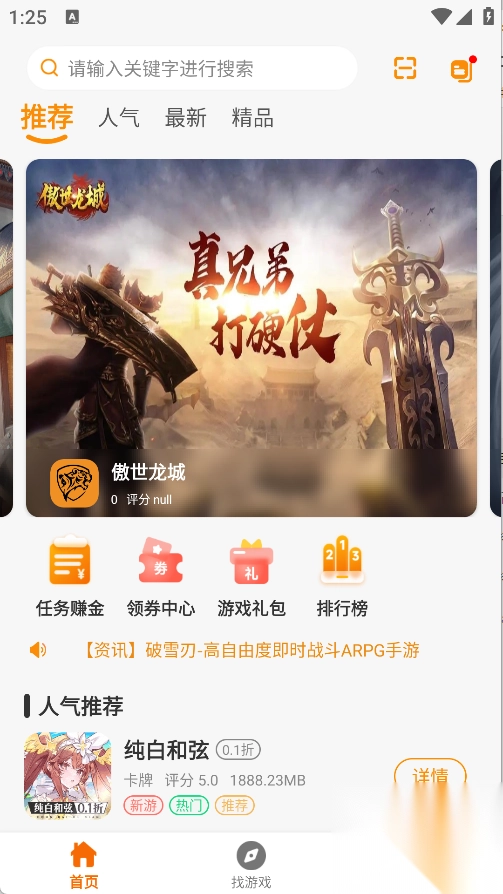 1. 首页包含推荐、人气、最新、新品这四大类型。其中,推荐板块涵盖任务赚金、领券中心、游戏礼包以及排行榜等内容。