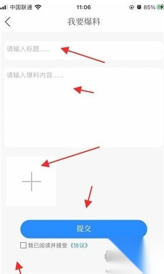 4、紧接着便要填写爆料内容,需将事情的标题以及详细经过清晰表述,若能附上相关照片则更佳。别忘记勾选下方的“我已阅读”,最后点击【提交】,这样就完成啦。