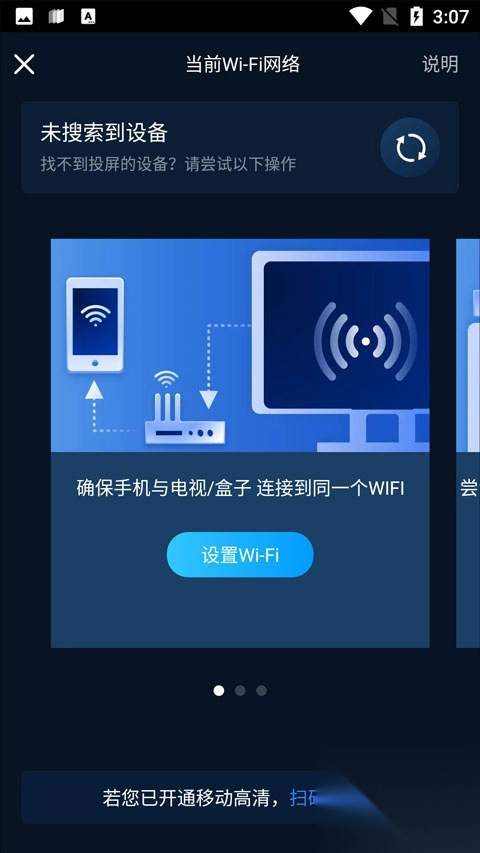 若依旧找不到设备,建议打开电视/盒子应用商店,免费下载“咪咕投屏"或“乐播投屏"App后投屏观看。