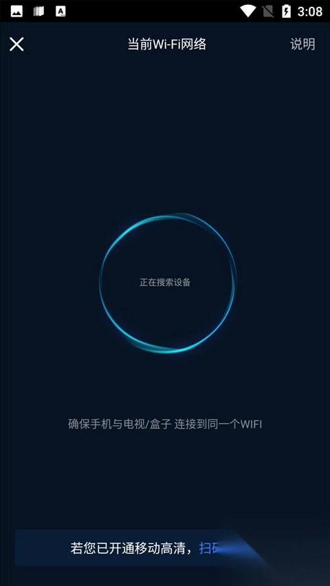 3、点击投屏图标之后,会自动搜索可以投屏的设备,如果要投屏到电视上,需要把电视打开,且打开无线投屏功能,和手机连接的是同一个wifi