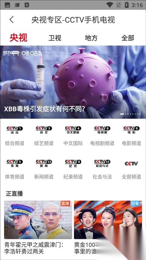 1、打开软件,在首页可以看到拥有央视专区这个选项