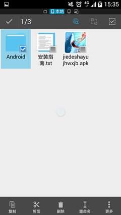 接着,依旧是那个文件夹,选中Android文件夹,点击左下角的“复制”选项。随后回到手机存储的根目录,像小编这里,根目录就是0。